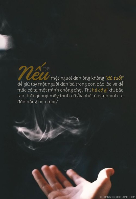 Nếu một người đàn ông không "đủ tuổi" để giữ tay một người đàn bà trong cơn bão lốc, để mặc cô ta một mình chống chọi. Thì hà cớ gì khi bão tan, trời quang mây tạnh cô ấy phải ở cạnh anh ta đón nắng ban mai?