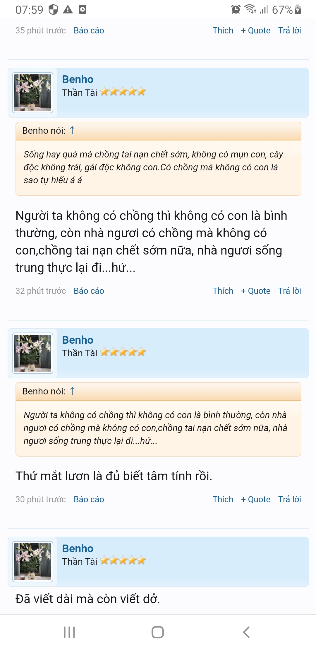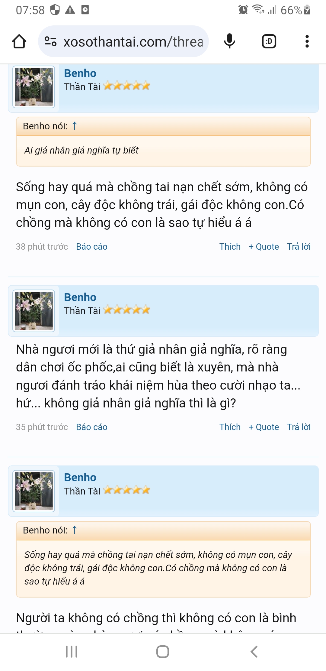 Gần đây nick @Benho gây sự với ace diễn đàn, nếu nói chiện nghe lọt lỗ tai ko có gì đàng này: chủi ace dd nào là NGU, DỐT..... và đến hôm nay bà ấy lôi những nỗi đau của ace lên để nguyền rủa chửi. Họ đã mất đi người thân, nỗi đau đấy ko có gì xoa dịu vậy mà làm người ai nỡ lôi nỗi đau đó ra để dày vò. Ác độc quá. Những sự việc như vậy đề nghị ad xem xét xóa nick vĩnh viễn ko cho tham gia dd. Screenshot_20240304-075859_Chrome.jpg Screenshot_20240304-075906_Chrome.jpg