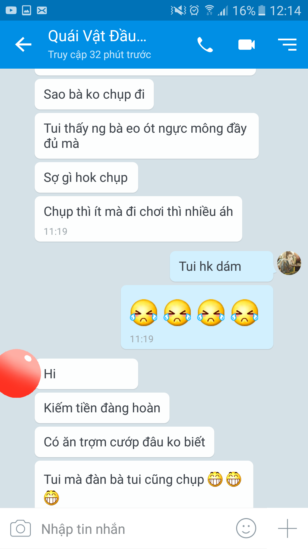 dĩ nhiên là nó pải khen rồi mới kêu chụp , chẳng lẽ nói mặt mũi xấu ỉn mà chụp , tiếp nữa là ko ai chụp nude mà khen cái mặt , chụp nude là body pải đẹp , đó là điều kiện tiên quyết, coi tiếp mấy cái tn của e thì thấy đối thoại như vậy là ko ổn rồi , nếu có lời khuyên thì khuyên là 1ngan lần ko ,hệ lụy sau lần chụp này sẽ là 100trieu ko rửa được chứ đừng nói là 20tr e đang cần để trả,